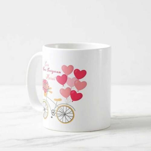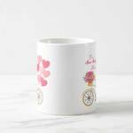 Üzerinde sarı bisikletli pembe çiçekli ve kalp balon desenli beyaz porselen kupa ... devamı >
